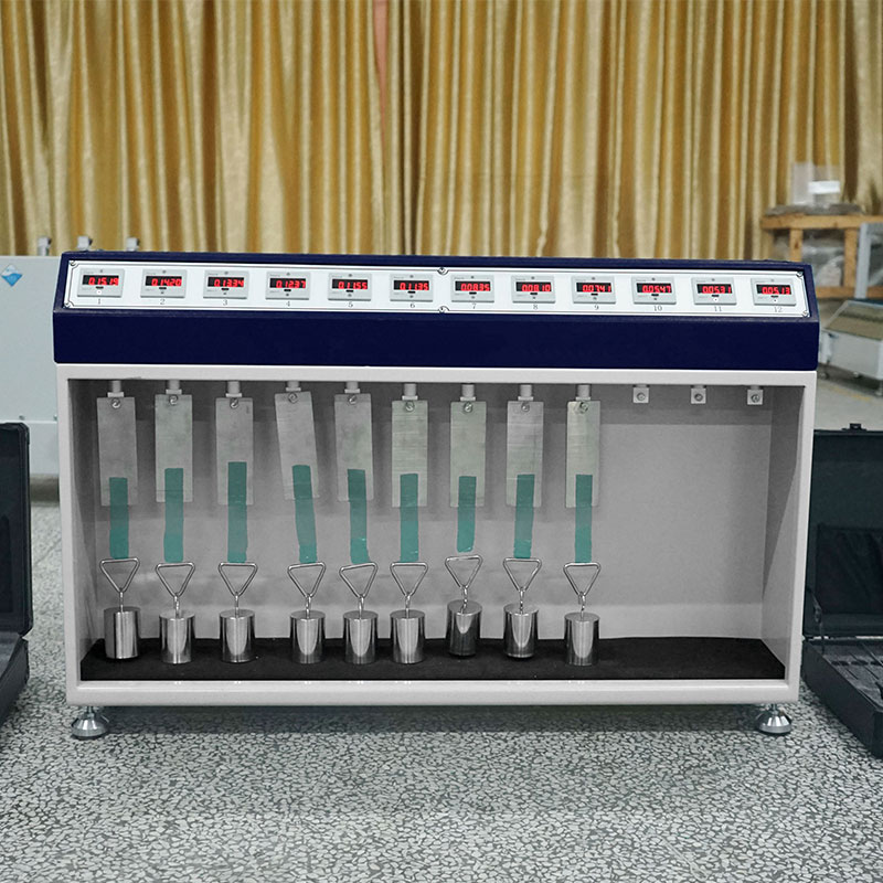 HD-C524-12 常溫膠帶保持力試驗儀,將試樣膠帶在室溫下,對膠帶的粘合力做靜態(tài)負荷試驗,通過膠帶貼合的保持時間,以判斷膠帶持粘性。